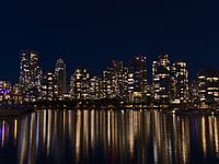 Vooraanzicht van de glanzende skyline van Vancouver, British Columbia, Canada in de duisternis van de avond met de lichten van de wolkenkrabbers wazig weerspiegeld in het kalme water van False Creek Bay.