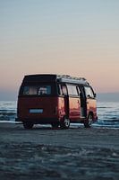 Pure vrijheid: een klassieke camper staat pal aan zee bij Blokhus aan de Deense Noordzeekust, terwijl de zon langzaam wegzakt in het avondlicht. Dit motief wekt reislust op en de droom van een eenvoudig leven tussen strand, wind en golven.