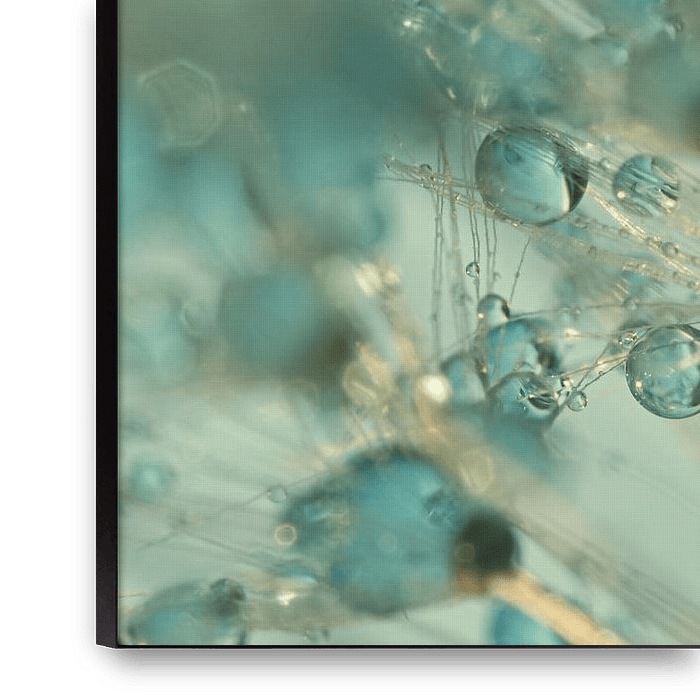 Koop dit abstracte kunstwerk Vanuit de pluizenbol: Druppeltjes in het warme licht met turqouise van Marjolijn van den Berg op canvas, aluminium dibond, (ingelijste) fotoprint, behang en ArtFrame, op maat geprint in Fine-Art kwaliteit.