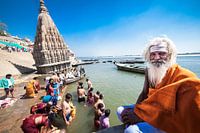 A priest sits on the bank of the Ganges river as others are spiritually washing themselves in the background.
