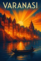 Koop dit landschapskunstwerk Varanasi Zonsopgang - Art Deco Ganges Poster van Travel Shop als print op canvas, aluminium dibond, (ingelijste) fotoprint, behang en ArtFrame. Voor jou op maat geprint in Fine-Art kwaliteit.