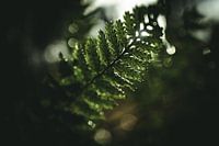 Een sfeervolle foto van een varenblad in het ochtendlicht.