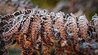 Macro opname van een met vorst bedekte uitgebloeide varen.