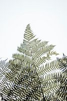 Deze fotografische compositie toont een varen blad dat zich elegant uitstrekt tegen een zachte, witte achtergrond, met een spel van schaduwen dat het beeld een bijna grafisch karakter geeft. De transparantie van het blad en de herhaling van patronen creëren een visuele diepte en rustgevende symmetrie. De lichtinval benadrukt de verfijnde structuur, waardoor het geheel voelt als een natuurlijke mandala. Een sereen kunstwerk voor liefhebbers van botanische abstractie.