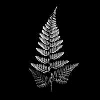 Een zwart/wit foto van een varenblad, fine art. De diep zwarte achtergrond vervreemd de natuurlijke uitstraling van het onderwerp. De belichting benadrukt de textuur van het blad.