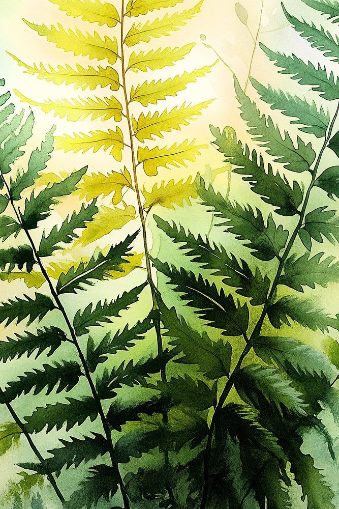 Een etherische aquarel compositie van sierlijke varens in verschillende tinten groen en geel, die zich elegant tegen een lichte, dromerige achtergrond ontvouwen. De delicate penseelstreken en subtiele kleurovergangen creëren een harmonieus spel van botanische vormen, waarbij de varenbladeren zowel kracht als verfijning uitstralen.