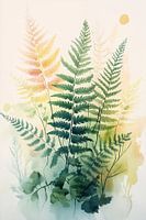 Een etherische aquarel compositie waarin varens de hoofdrol spelen. De bladeren reiken sierlijk omhoog in verschillende tinten groen, met subtiele overgangen naar warmgele en perzikkleurige tinten. De waterverf techniek creëert een dromerige, lichte sfeer waarin de varens lijken te dansen tegen een zacht verlopende achtergrond van mint naar goud.
