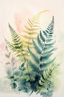 Een dromerige aquarel compositie van sierlijke varens in zachte, vloeiende tinten van groen, turquoise en geel. De delicate bladeren zweven tegen een zacht roze en mint-groene achtergrond, waarbij de waterverf techniek zorgt voor een etherische, bijna mystieke sfeer die de natuurlijke elegantie van de plant perfect vangt.