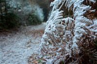 Besneeuwde varens op een winterse ochtend in het bos.