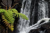 Varens aan de voet van de pittoreske waterval Baker's Falls in de Horton Plains National Park in Sri Lanka, vlak bij World's End. Het groen van de varens contrasteert mooi met het zwart van het gesteente achter de waterval. Ook het bruisende water van de waterval vormt een mooi contrast