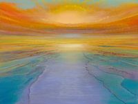Over het geheel genomen straalt dit schilderij een diepe rust en sereniteit uit. Het herinnert de kijker eraan hoe de natuur in staat is om zo'n adembenemende schoonheid te onthullen in een moment van transformatie. Het kleurverloop bij zonsondergang laat ons zien hoe de wereld voortdurend verandert en hoe belangrijk het is om deze kostbare momenten te koesteren. Het nodigt de kijker uit om de magie en poëzie van de zonsondergang te ervaren en geïnspireerd te raken door de vrede en rust van dit moment.