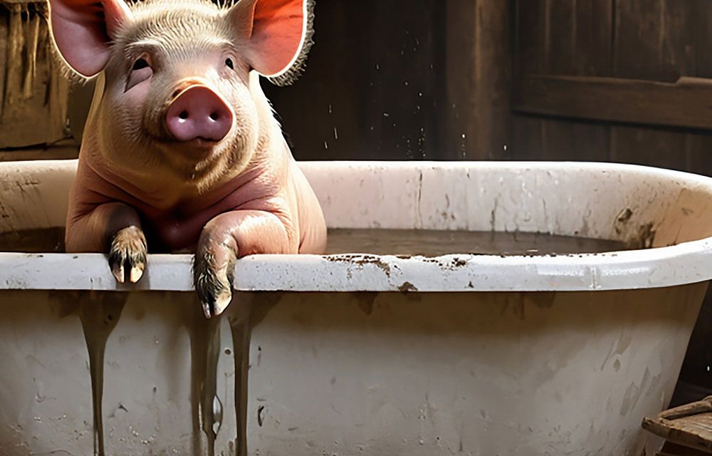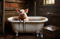 Een schoon roze varken, maar niet voor lang meer, zit in een badkuip, vol met modder. Het modderbad staat in een oude stal die ook vol met modder ligt, de droom van elk varken. Het beeld is met behulp van ai gegenereerd.