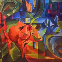 Franz Marc was een Duitse kunstschilder die bekend stond om zijn expressionistische stijl. Zijn werk "Varkens" is een goed voorbeeld van zijn stijl en laat een groep varkens zien die in een weiland rondrennen. De varkens zijn afgebeeld in felle en expressieve kleuren, wat het een krachtig en emotioneel werk maakt. Marc gebruikte zijn schilderijen om zijn visie op de natuur te laten zien, en in "Varkens" laat hij zien hoe hij de vrijheid en de wildheid van de dieren zag. Het is een indrukwekkend werk dat de kracht van expressionistische kunst laat zien.