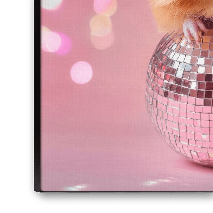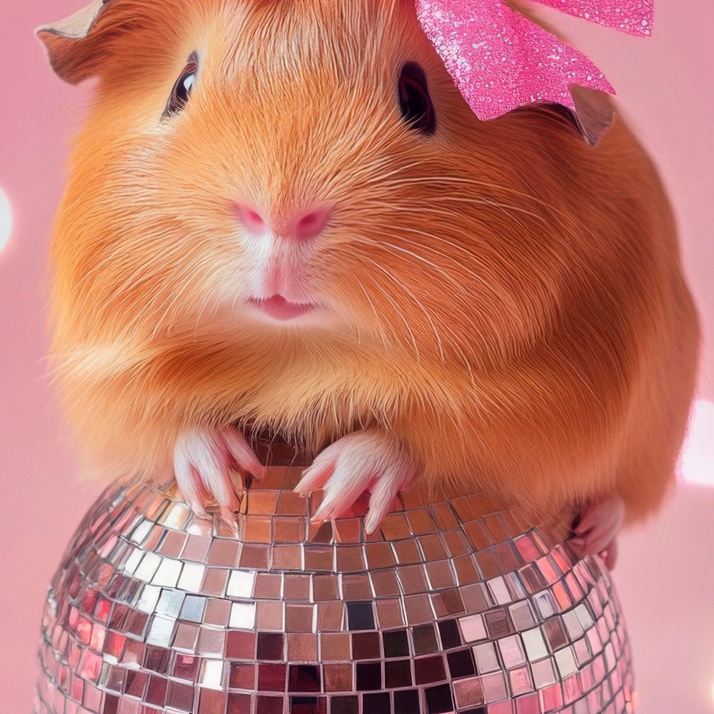 Een schattige cavia troont op een glinsterende discobal te midden van glinsterende roze lichtjes. Versierd met een grote, fonkelende strik straalt hij charmante zelfverzekerdheid uit. Dit grappige dier in zijn glamoureuze pose brengt pure vreugde en het sprankelende nachtgevoel van een feestavontuur recht in het hart!
