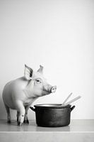 Een charmant, speels element voor de keuken: een vrolijk varkentje dat nieuwsgierig over een gietijzeren pot tuurt. De combinatie van de zachte melancholie van het zwart-wit en de levendige vorm van het varkentje brengt een vleugje humor en creativiteit in de kamer. Perfect als blikvanger in elke moderne keukeninrichting!
