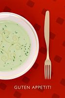 Een vorkmes van roestvrij goud naast een bord soep. Grapje met een onmogelijke maaltijd.