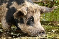Dit varken stond in een ondiepe sloot kroos te eten.
