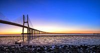Vasco da Gama-brug in Lissabon bij zonsopgang met een heldere hemel en eb. Gefotografeerd als panoramafoto