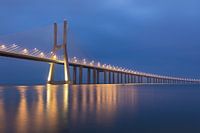 Vasco da Gama brug in Lissabon over de rivier de Taag op het blauwe uur en met de opkomende zon.