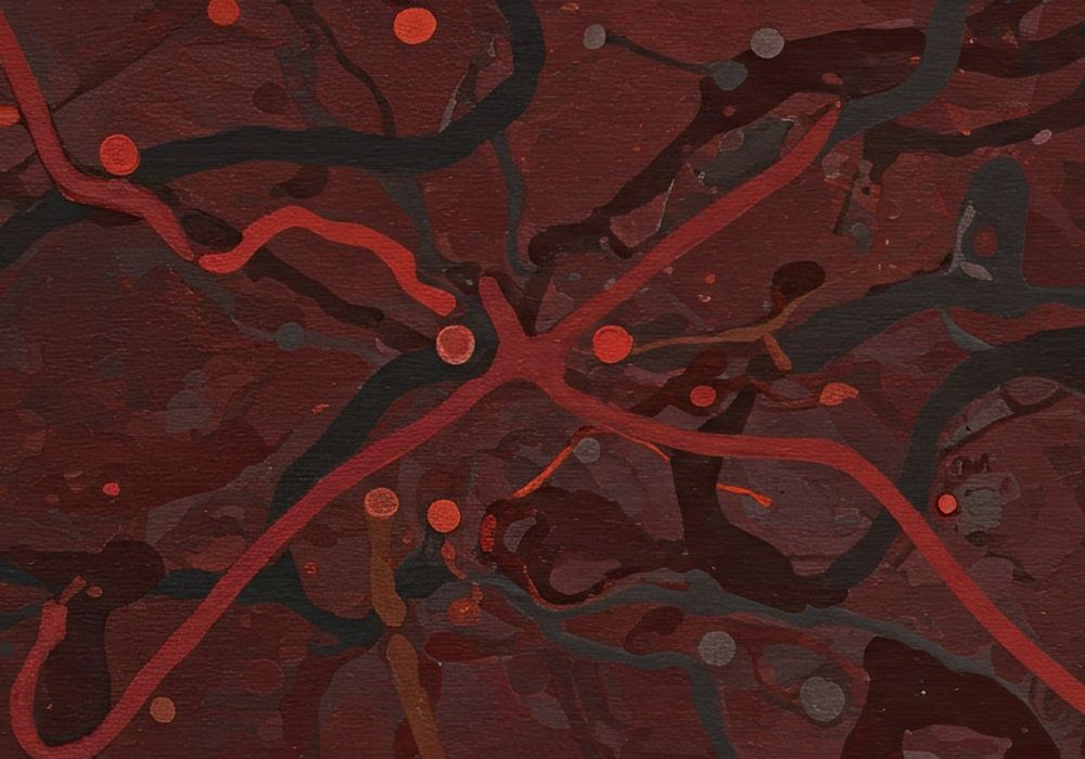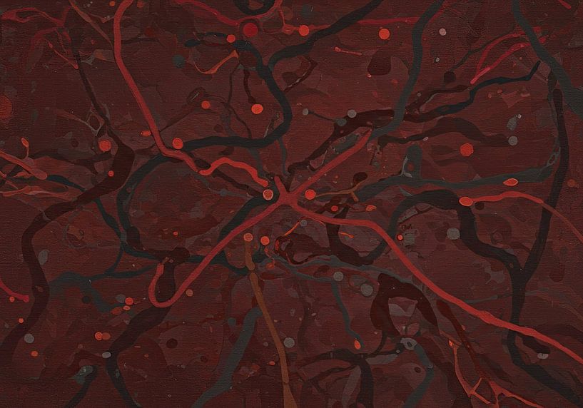 Dit abstract expressionistische werk wordt gekenmerkt door een donkere, rijke monochrome rode en kastanjebruine achtergrond, met een complex netwerk van druipende en spattende lijnen in zwart, grijs en karmozijnrood. De overlappende, chaotische lijnen en verspreide cirkelvormige stippen roepen een gevoel op van microscopisch leven,…
