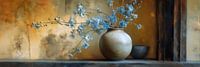 Vase and Bloom - Dit bloemen schilderij is een Japandi-stilleven met een grote bolle keramische vaas en uitwaaierende dunne takken met zachte blauwe bloemen tegen een warm oker-zand achtergrond in een subtiele impressionistische stijl, perfect als bloemen schilderij, schilderij bloemen of stilleven met bloemen voor een modern…