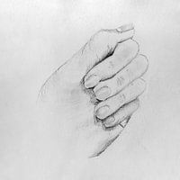 Een eenvoudige figuratieve schets van een mensenhand die iets..... vasthoudt. Volledig met de hand getekend volgens de traditionele methode van potlood op papier. Een uniek stukje minimalistisch kunstwerk gemaakt door mensen, van mensen, voor mensen.