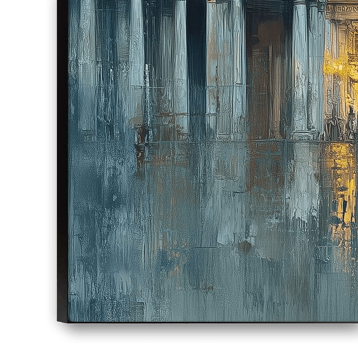 Het ontwerp is niet zomaar een weergave van een historische plek, maar een moderne interpretatie die traditie en creativiteit samenbrengt. De abstracte stijl zorgt ervoor dat elk detail uitnodigt tot interpretatie en bewondering, waardoor het schilderij bij elke blik iets nieuws prijsgeeft. De panoramische breedte zorgt ervoor dat het perfect tot zijn recht komt boven een bank, eettafel of in een entreehal.