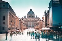 We kijken richting het Sint Pietersplein, waar jaarlijks miljoenen toeristen lopen om de atmosfeer te proeven en misschien wel een glimps van de paus op te vangen.