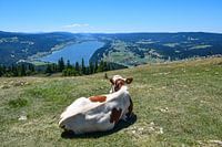 Een koe geniet van het zonnige uitzicht op het Lac de Joux vanop de top van de Dent de Vaulion, in het Juragebergte in het westen van Zwitserland.