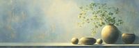 Vazen Bloemen | Quiet Vase Table - Dit stilleven schilderij toont een rustig liggend stilleven van ronde aardewerkvazen en twee bolvormige objecten naast een grote vaas met ranke takken en groene bladeren, uitgewerkt in een moderne realistische stijl met zacht blauw-gouden achtergrond en warm licht, een schilderij stilleven dat perfect…