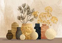 Vazen met Bloemen - Dit is een stilleven schilderij met vazen en bloemen, waarbij de nadruk ligt op elegant gevormde vazen in diverse aardetinten en delicate gele bloemen die speels uit de potten komen, wat zorgt voor een moderne uitstraling in een trendy interieur.