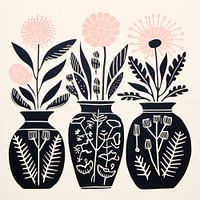 Linoleum afbeelding van drie zwarte vazen met roze bloemen. De figuren zijn uitgesneden/gegutst in linoleum en vervolgens afgedrukt. Zwarte vazen met witte takken, blaadjes en bloemetjes. Witte achtergrond. Passend bij diverse stijlen en trends. Linoprint.
