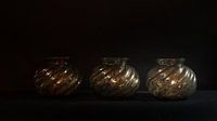 Drie glazen vazen op donkere achtergrond met lichtverloop en lichtreflectie door het ribbelpatroon van de vazen. Studio opname met flits van opzij.