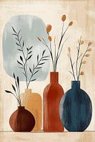 Een stijlvolle minimalistische compositie van vier decoratieve vazen in warme aardetinten tegen een zachte beige achtergrond. De vazen, variërend van rond tot ovaal, zijn gevuld met sierlijke droogbloemen en takjes. Het kunstwerk straalt rust uit door het gebruik van terracotta, navy en zandtinten, gecombineerd met een subtiel blauwgrijs accent.