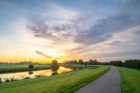 Zonsopgang boven de rivier de Vecht tijdens een mooie herfstochtend in Overijssel, Nederland. De Overijsselse Vecht ontspringt in Oberdarfeld in de Duitse deelstaat Noordrijn-Westfalen en stroomt noordwaarts naar Nedersaksen, over de grens met de Nederlandse provincie Overijssel. Daar stroomt de rivier door de regio Salland en vlakbij Zwolle mondt de rivier uit in het Zwarte Water.
