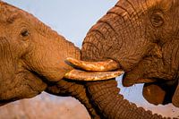 Vechtende mannetjes Afrikaanse Olifanten van dichtbij gemaakt met zacht sfeerlicht in Zuid-Afrika.