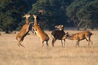Hinden vechten om een appel in Nationaal Park de Hoge Veluwe. Vooral tijdens de bronsstijd worden edelherten bijgevoerd met appels, zodat fotografen de herten van nabij kunnen fotograferen vanaf