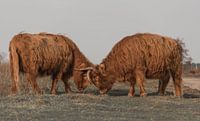 Twee Schotse Hooglanders vechten met elkaar, in natuurgebied Huis ter Heide in De Moer in Nederland. Het gebied wordt beheerd door Natuurmonumenten.