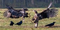 Een koppel jonge zeearenden die vechten om een prooi. De raven wachten hun kans af om ook een graantje mee te kunnen pikken. Een prachtig spektakel van wilde zeearenden in Polen.