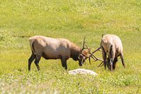 Net voor de bronsttijd draaien deze of Amerikaanse edelherten alvast warm voor de gevechten die ze in de paringstijd zullen gaan uitvoeren om de dames voor zich te winnen. Rocky Mountain Elks zijn indrukwekkende herten, een stuk groter dan de edelherten die we in Europa gewend zijn. Ook de geweien zijn enorm, deze kunnen zelfs groter worden dan 1,5 meter.