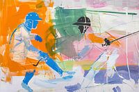 Twee polospelers in een duel in de stijl van een abstract schilderij.