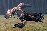 Een koppel jonge zeearenden die vechten om een prooi. Nummer drie wacht zijn kans af om ook een graantje mee te kunnen pikken. Een prachtig spektakel van wilde zeearenden in Polen.