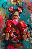 De foto toont een indrukwekkende dame in een kleurrijke outfit, poserend met rode bokshandschoenen en een bal kauwgom in haar mond. Haar opvallende wenkbrauwen en het uitgebreide haaraccessoire van rozen benadrukken haar sterke uitdrukking. De levendige, graffiti-achtige achtergrond versterkt de dynamiek en creativiteit van de scène.