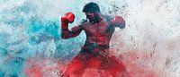 Een krachtige bokser, omringd door dynamische kleurspatten in rood en blauw, straalt energie en vastberadenheid uit. Deze levendige scène vangt het moment van het gevecht en brengt een intense sfeer over. Perfect voor een moderne woonkamer of een motiverende fitnessruimte thuis, het brengt dynamische inspiratie in elke kamer.