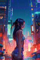Het portret van een jonge vrouw in een stad, gemaakt als een vector illustratie met neon en vele verschillende kleuren door elkaar heen, trok de aandacht van voorbijgangers op straat. Haar glimlach was zo echt dat het leek alsof ze ieder moment uit het portret kon stappen. De stad achter haar was een chaotische mix van neonlichten en kleurrijke gevels die een fascinerende sfeer creëerden.