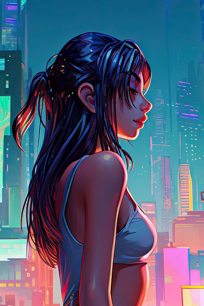 Het portret van een jonge vrouw in een stad, gemaakt als een vector illustratie met neon en vele verschillende kleuren door elkaar heen, trok de aandacht van voorbijgangers op straat. Haar glimlach was zo echt dat het leek alsof ze ieder moment uit het portret kon stappen. De stad achter haar was een chaotische mix van neonlichten en kleurrijke gevels die een fascinerende sfeer creëerden.