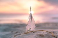 Een veer in de zonsondergang op het strand van Julianadorp. Gimmicks die de romantiek van een zonsondergang benadrukken.