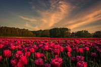 Tulpen velden bij Egmond aan den Hoef bij Zonsopkomst. Met 'De Wimmenumermolen', op de achtergrond, is een in 1774 gebouwde achtkante binnenkruier.