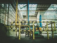 veel buizen die naar boven beneden en opzij gaan, op een verlaten locatie