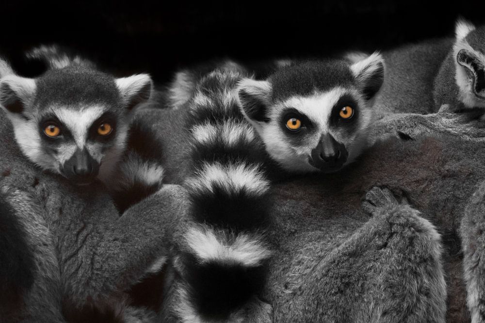 Veel kattenmaki's verzamelden zich op een hoop (groep) voor een nachtelijke slaap, rusteloze blik van brandende ogen van dieren. Geïsoleerd op zwarte achtergrond. Symbool van slapeloosheid en nachtmerries.
